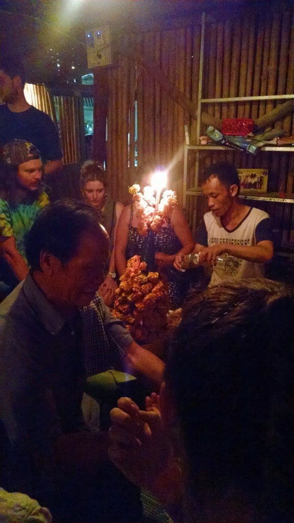 Some Lao locals stopped in to bless us by lighting a pyre, giving us a shot of rattlesnake whiskey, and tying an orange band around our wrists. The wearer cannot remove the band by force, or else bad luck will fall upon them. The entire setup proved exciting, and the huge quantities of booze only added to that excitement.